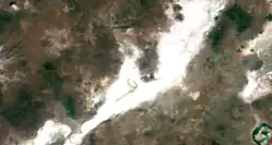 The playa of the Black Rock Desert lakebed is ~200 sq mi (520 km2) within an area bounded by the Calico Mountains Wilderness (north), Gerlach (west), the Applegate National Historic Trail (northeast), and the Union Pacific Railroad (south).[40] The "South Playa" (~30 sq mi, with ~13 sq mi (34 km2) in Washoe County) is between Gerlach and the southwest boundary of the National Conservation Area (NCA),[40] while the northeast NCA portion of the playa (including ~25 sq mi (65 km2) in Humboldt County) is between the NCA boundary and the Applegate National Historic Trail.[40] A Nobles route between Gerlach and Black Rock Hot Springs extends through the length of the playa.[40] The playa's Quinn River Sink of ~3 sq mi (7.8 km2) is where the Quinn River discharges/evaporates ~2.75 mi (4.43 km) south-southwest of Black Rock Hot Springs.[41]