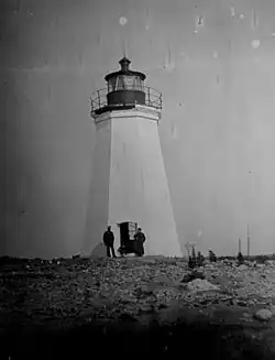 In 1807, the United States government bought the 9.5 acres (3.8 ha) of land upon which the lighthouse stands from Daniel Fayerweather for $200.[3] The government appropriated $5000 for the light station in February 1807 and contracted Abisha Woodward to construct the light.[3][4] The first Black Rock Harbor Light was a 40-foot (12.1 meter) octagonal wooden tower built in 1808.[3] Abisha Woodward, who previously constructed the 1801 New London Harbor Light and the 1802 Falkner Island Light, constructed a wooden tower that was lit and made operational by October 1808.[5] The lightkeeper's home was a small 1+12-story home built on the opposite side of a marsh, several hundred feet away from the tower.[5] Another brick structure was built to house the oil.[5] The total cost of the wooden lighthouse, and likely the accompanying keeper's house and oil house, was listed at $4604.69.[6]