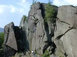 The crag has been a well-known traditional climbing venue since the 1890s, and features in the early 1913 guidebook, Some Gritstone Climbs.[1][5] Black Rocks has some easier traditional climbing routes of grades Diff to VS 4c, and a selection of short bouldering problems of grades V0 (4) to V9 (7C), however, it is most noted for its historic extreme traditional climbing routes put up in the mid-1980s to the early 2000s.[1][5] Its northerly aspect means that it is frequently in damp condition (and even covered in green algae), however, the sandstone-like gritstone rock dries reasonably quickly.[1][5]