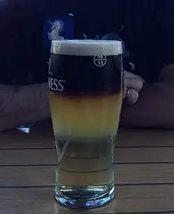 ![]() A layered Black Velvet cocktail with the stout on the top | |