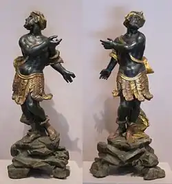 Blackamoor is a type of figure and visual trope in European decorative art, typically found in works from the Early Modern period, depicting a man of sub-Saharan African descent, usually in clothing that suggests high status. Common examples of items and objects decorated in the blackamoor style include sculpture, jewellery, and furniture. Typically the sculpted figures carried something, such as candles or a tray. They were thus an exotic and lightweight variant for the "atlas" in architecture and decorative arts, especially popular in the Rococo period.