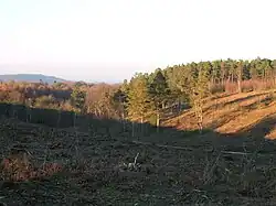 Blackdown is in the far northwest of West Sussex. The hill presents as a dark-sided mass that towers over the western parts of the Low Weald and south-west Surrey. There is no village or hamlet on Blackdown although it lies approximately equidistant from the railway town of Haslemere 2 miles (3.2 km) to the northwest, Fernhurst to the southwest, and Lurgashall to the southeast.[2]