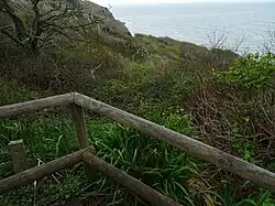 The location is based on unstable terrain owing to the underlying Gault Clay strata, resulting in a succession of huge landslips giving the area a very rugged appearance akin to the better known Jurassic Coast.[9] Currently the cliffs are eroding at a rate of about 3.5 metres per year, although this process is not gradual nor consistent.[10] Continuing landslides and coastal erosion swept away the paths in the early 1900s, and have since obliterated the chine itself and repeatedly forced the park owners to move the clifftop facilities inland.[3]