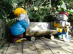A collection of mainly German garden gnomes doing various day to day chores . Most famous are the gambling gnomes playing cards . Re sited a few times, latterly called Gnomeywood, a play on the word Hollywood . This latter version was opposite chimney pot walk . The last gnomes garden was near the current park entrance but since removed . Most gnomes are believed to now be in storage . But a few have escaped and can be found located especially in the underwater kingdom and nursery land . |