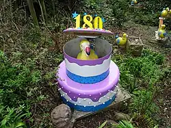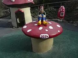 Also in Nurseryland is the wishing tree, a tree that houses a family of musical pixies. A vicar on a seat provides a popular photo opportunity, along with a toadstool which since the 1990s has had its date changed annually to the corresponding year. Nurseryland was sited on an area previously on park maps named as the fern Glen. It was expanded for the 1980 season with new additions. Little Miss Muffet was removed circa 2020. As of 2025 NurseryLand has a new perimeter fence . As of 2025 a new entrance pathway is going in nearer the chine café. As of 2025 the NurseryLand lookout viewpoint platform and talking telescope have been removed due to continual cliff erosion in the area . |
