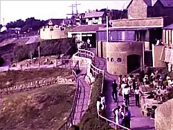 The entrance and bazaar was located in front of the chine gorge . later extended with round porthole style windows with a footbridge leading off it to the chine gardens. A brand new purpose-built shop opened in the old bazaar in 1982 . Closed in 1985 due to coastal erosion, a new shop and entrance were opened in 1986 in its current location .The old buildings were demolished in the summer of 1989. |