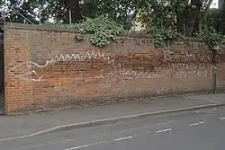It is thought that the white graffiti, the earlier of the two, was the work of delegates at the Drapers' Conference at Keble in the early 1970s and was a reply to the students of Keble's neighbour St John's College who had formed the St John’s Destroy Keble Society.[9] An alternative version suggests that students from Wadham and Somerville Colleges were responsible.[10] Close by in Parks Road is the Oxford University Museum of Natural History where a number of fossilized dinosaur skeletons can be seen. There was a hatching-dinosaur-egg addition on the wall for a while but it has disappeared.