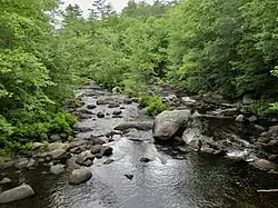 The Blackwater River is formed at Cilleyville,[2] a village in the western part of the town of Andover, by the junction of two branch streams. Cascade Brook, the western branch, begins at Cascade Marsh in the northeast part of Sutton and flows northeast to Wilmot Flat, where it is joined by the outlet of Pleasant Lake of New London before continuing east to Cilleyville. Frazier Brook, the northern stream branch, rises just south of Danbury village and flows south parallel to Route 4, passing South Danbury, flowing through Eagle Pond in Wilmot and then through Bog Pond below West Andover, joining Cascade Brook just south of the outlet of Bog Pond. Kimpton Brook (formerly known as Quickwater Brook[2]), flowing easterly through the village of Wilmot Center, is the primary tributary of Eagle Pond.