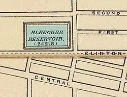 Bleecker Stadium was built as a Federal public works project;[4] originally the stadium was the Bleecker Reservoir, which was constructed in 1850.[5] As Governor of New York, Franklin D. Roosevelt established a jobs relief program that made the conversion of the reservoir, which had become obsolete, possible; and this led to the creation of between 500 and 1,000 jobs. The stadium opened on Thanksgiving Day 1934. The clubhouse was built in 1940 under the Works Progress Administration, also set up by Roosevelt, who by then was President of the United States. Covering 9.5 acres (3.8 ha), the stadium was the ninth largest in the entire United States and the second largest on the East Coast behind Philadelphia. It was named for Albany businessman James Edward Bleecker, a member of an old Albany family which produced several mayors and other officials.[6]
