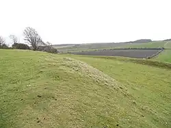 The rampart was built a considerable time later than the original timber palisade that defended the early settlement.[8] The rampart was originally 6.4 metres (21 ft) wide, with a 4 metres (13 ft) gap between the inner and outer retaining timber supports.[9] The rampart was built from chalk packed firmly between the timber retainers.[10] The second phase of the rampart was of the "Low Dump" type, with an asymmetrical cross-section and a shallow incline towards the rear, with a much steeper front dropping directly into the ditch.[11] This replaced the earlier filled-timber wall-and-fill style of rampart.[12] In the eastern part of the hillfort, the rampart has been badly damaged by ploughing, and in places destroyed. In the western portion, part of the rampart survives as a sunken lynchet, and the ditch there survives as a flat terrace.[2] In the first phase of the rampart, the ditch was approximately 1.5 metres (5 ft), but when it was recut for the second phase it was deepened to 4.6 metres (15 ft).[2] The hill features a number of unusual terraces or lynchets, the age and function of which is unknown, although they are believed to post-date the Iron Age.[2]