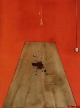 Blood on the Floor (Painting, 1986)[1] is a 1986 oil-on-canvas panel painting by the British artist Francis Bacon. The panel shows a violent splash of blood, formed from drips of paint, on a bare canvas-coloured floor, which may be a wooden plank or diving board, against a harsh, flat, orange background.[2] The foreground contains two suspended light bulbs, one white, one molten yellow,[2] and a light switch.