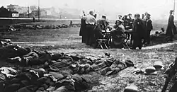 After two weeks of relative quiet, a second German punitive expedition arrived in Olkusz shortly after midnight on July 31. It included Gestapo personnel, as well as members of German gendarmery and police, and possibly – accounts vary – regular Wehrmacht soldiers. From around 2:00 a.m German forces started to gather all the local men at least 15 years old who were either ethnic Poles or Polish Jews.[4]: 19–21 Prisoners were told to lie down flat, face down, on the ground for many hours, until about 3:00 p.m., while the Germans verified their documents, and in the meantime were subject to abuse and beatings. Some victims were ordered to take part in a makeshift parade and bathe in the local muddy river and its banks. Jewish inhabitants were often singled out for extreme abuse, stripped naked, stomped upon, forced to recite Christian prayers, and even to stone one another.[4]: 20–21 [5]: 95 [8]: 176–179 [11] One witness reported an incident in which a German soldier crushed the face of a Jew on whom he stomped. A photograph of Rabbi Moshe Hagerman the Dayan, one of several taken by German soldiers, would become one of the most famous images from that day, and also described as one of the iconic images of the Holocaust in Poland.[10][12]: 37, 40 [13]: 107 Rabbi Hagerman, forced by Germans to pray, for their amusement, and abused on that day, survived until 1942, when he was murdered in Majdanek concentration camp.[10] Rabbi Hagerman's photograph became best known outside Poland, while in Poland the better known picture, described as "known to everyone in Olkusz", shows a lone German sentry guarding a group of prone men lying down in the Olkusz town square.[9]: 212