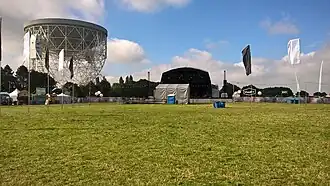 ![]() Setting up the 2016 festival. Bluedot takes place against the backdrop of the Lovell Telescope at Jodrell Bank Observatory (JBO) in Cheshire. | |