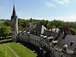 A labour camp of the Reich Labour Service was operated in the village under Nazi Germany.[3] After World War II, Lower Silesia became again part of Poland and the palace became state property. It was gradually turning into a ruin, the interiors were mostly destroyed and even stolen. In 1956, a partial renovation was done. Later, the palace was housing a local school for many years. The Polish drama film Shivers from 1981 was filmed in the Bożków Palace. Currently, the palace is in private hands. In February 2021, it was again offered for sale.[4]