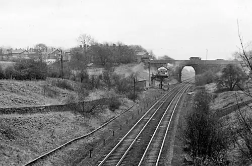 The Wigan Branch Railway (WBR) was authorised on 29 May 1830 to connect the town of Wigan to the Liverpool and Manchester Railway at Parkside, and it opened on 3 September 1832. A railway route between Wigan and the town of Preston, in the form of the Wigan & Preston Railway, was authorised by Parliament on 22 April 1831; but before it was built, this company amalgamated with the WBR under an Act of 22 May 1834, to form the North Union Railway (NUR) - the first railway amalgamation to be sanctioned by Act of Parliament.[1] The line was opened throughout between Wigan and Preston on 31 October 1838,[2] and Boar's Head station opened the same day;[3] it was the first station on the route to the north of Wigan.[4]