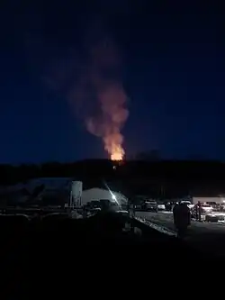 On February 11, 2014, Chevron's Lanco 7H well caught fire and burned for several days. The well is located about one mile west of Bobtown on Bald Hill Church Road.[8] The explosion killed contractor Ian McKee, a field service technician for Cameron International, and slightly injured another worker.[9] Chevron representatives distributed pizza coupons to residents as compensation for traffic caused by emergency responders and press.[10] The pizza issue gained national attention from various media outlets, including Comedy Central's The Daily Show which interviewed the owners of Bobtown Pizza.[11][12]