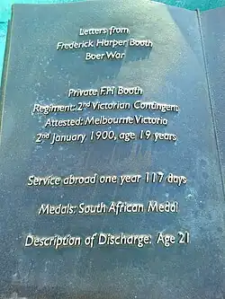 Explanation of the soldier whose letters adorn the memorial: Private Frederick Harper Booth, 2nd Victorian Contingent