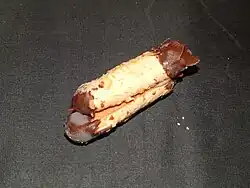 Bokkenpootje (Dutch pronunciation: [ˈbɔkə(n)ˌpoːcə], literally "goat's foot") is a traditional Dutch cookie consisting of two elongated almond meringue cookies sandwiched together with buttercream filling and dipped in chocolate at both ends.[1][2] The distinctive shape resembles goat's hooves, hence the name.[3] The cookies are characterized by contrasting textures: crunchy exterior from the meringue base and chocolate coating, with soft interior from the cream filling.[4] Preparation involves creating an almond-based meringue mixture, piping into log-shaped forms, baking until crisp, pipe a line of buttercream filling in the centre of one biscuit and sandwich a second biscuit on top, and dipping ends in melted chocolate.[2][5] Variations include almond paste, apricot jam, or custard cream fillings.[1]