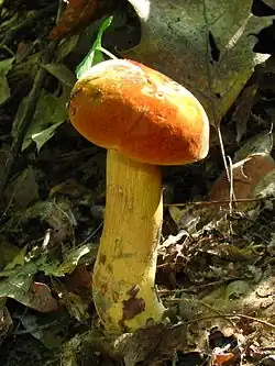 Boletus subluridellus is a species of bolete fungus in the family Boletaceae. Described as new to science in 1971 by American mycologists, the bolete is found in the eastern United States and Canada. It grows on the ground in coniferous and mixed forests in a mycorrhizal association with deciduous trees, especially oak. The fruit bodies (mushrooms) have orangish-red, broadly convex caps that are up to 10 cm (3.9 in) in diameter, with small, dark reddish pores on the underside. The pale yellow stipe measures 4–9 cm (1.6–3.5 in) long by 1.5–2.3 cm (0.6–0.9 in) thick. All parts of the fruit body will quickly stain blue when injured or touched.