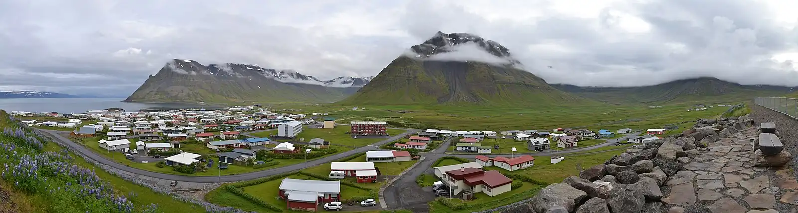 Bolungarvík is close to abundant fishing grounds and has been used as an outpost for fishing since the 17th century, making it one of the earliest in Iceland.[2] The village was not accessible by road until 1950, and in 2010 the Bolungarvíkurgöng tunnel was opened under the Óshlíð mountain to bypass the old road, which was frequently subject to avalanches and rock falls.[3]
