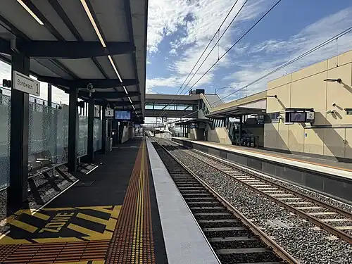 As part of the Level Crossing Removal Project, the station was reconstructed to remove the adjacent level crossing at Bondi Road, with works commencing on 26 July 2021. The removal was done simultaneously alongside the grade separation of Chelsea and Edithvale. On 22 November of that year, the rebuilt station opened to passengers.[12][13] The new station consists of two side platforms lowered into a trench, with Bondi Road passing overhead nearby. The former pedestrian level crossing at Golden Avenue was converted into a pedestrian overpass, whilst the crossing at Broadway was abolished.[14][15]