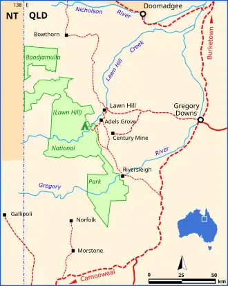- ^ a b c "Boodjamulla (Lawn Hill) National Park (entry 43617)". Queensland Place Names. Queensland Government. Retrieved 25 June 2017.