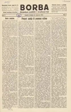 The first issue of Borba was published in Zagreb on 19 February 1922. Đuro Cvijić and Kamil Horvatin were the editors of the newspaper at its founding.[2] It was the official gazette of the League of Communists of Yugoslavia (LCY),[1] a banned political organization since December 1920 that nevertheless operated clandestinely in the Kingdom of Serbs, Croats and Slovenes and later Kingdom of Yugoslavia. From 1924, the editor of Borba was Vladimir Ćopić, who was soon arrested for his articles against the government. Functioning as the banned Yugoslav Communist Party's propaganda piece, the paper played in important part in disseminating information among the party members, activists, and sympathizers.