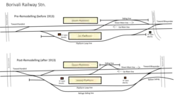 Before and after diagrams of Borivali railway station, showing changes in layout after the remodeling scheme of 1913