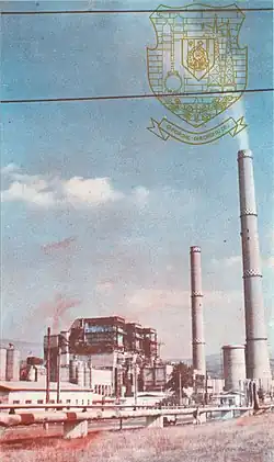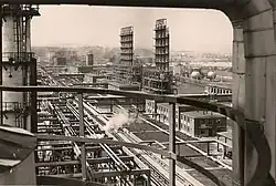 The petrochemical plant was built in four stages: First stage (1952-1960), comprises the first works from the Borzești Thermal Power Plant (1952), the No. 10 Oil Refinery[12] (by H.C.M .1683/1952[13]), the Rubber Plant (H.C.M. 1498/1957[14]) grouped on 610 ha; (1961-1965), the phenol, acetone equipments (1961), synthetic rubber (1963) and styrene-polystyrene (1964), the industrial platform exceeds 846 ha. In the third stage (1966-1970), works were started at Refinery II and the Poly-isoprenic factory. In the fourth stage, two industrial objectives were put into operation: Synthetic Rubber Plant II and Refinery II. The surface of the platform has exceeded 1000 hectares and includes the city platform based on the food industry, wood processing and others.[12]