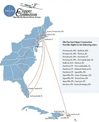 Boston-Maine Airways and the Pan Am Clipper Connection served the following destinations at various times during its existence:[8][9][10][11][12]