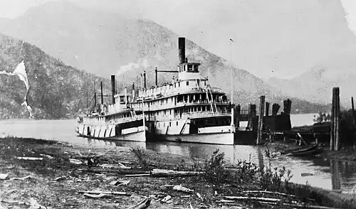 During the 1890s, mining activity peaked in the area. D. McGregor prospected on McGregor Creek. In the early 1900s, about 3 kilometres (2 mi) south at Akokli (Goat) Creek, miners worked the stream. Their rock pier for loading ore was one of the first on the east side of the lake. Mining claims were also staked at Lockhart and La France creek, respectively about 6 kilometres (4 mi) and 8 kilometres (5 mi) north of Boswell.[16] The La France Mining Co, formed in 1906, completed extensive underground tunnelling but shipped no ore before the venture collapsed during World War I.[16] Akokli Creek was the industrial heart. The Valparaiso, staked in the mid-1890s, was the most famous property. Mining continued sporadically. However, gold and silver recoveries proved uneconomic. A small aerial tramway to the lakeside was installed in the 1930s, but the mine closed in 1941.[17]