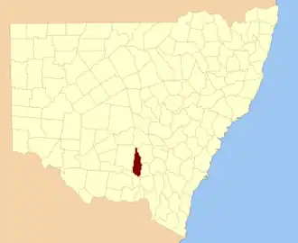 Bourke County is one of the 141 cadastral divisions of New South Wales. It contains the entirety of the Coolamon Shire, including the towns of Coolamon, Ganmain and Ardlethan; as well as parts of Bland, Narrandera and Temora Shires and part of the City of Wagga Wagga. The Murrumbidgee River is the southern boundary.