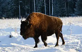 The wisent, or European bison, was originally crossed with cattle in an attempt to reinvigorate the declining wisent population. First generation hybrid males are sterile, but females may be crossed back to either a wisent or domestic bull to produce fertile males.[1] Modern wisent herds keep hybrids well isolated from pure wisent. However, since the modern purebred wisent descend from fewer than two dozen individuals, a significant genetic bottleneck has resulted for the purebred wisent.