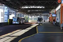 A sheltered thirteen-bay bus terminus is located on the rooftop of the Box Hill Central Shopping Centre, two levels above the station. The terminus serves 20 bus routes operated by CDC Melbourne, Kinetic Melbourne and Ventura Bus Lines. The bus deck originally had 14 bus bays, but bay 12 was removed around 2015 to enable safer access to the lift in the office suites. In 2018, the position of bays 2 and 3 were swapped so that passengers queuing to board SmartBus route 903 southbound would not be in the way of the food kiosk.