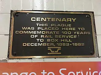 Box Hill station opened on 1 December 1882 when the railway line from Camberwell was extended to Lilydale.[3] When the station opened, Box Hill was a separate town with several hundred residents.[4] It was named in 1861 after Box Hill in Surrey, England, which was the birthplace of the local postmaster.[4] In 1895, a large market was opened next to the station.[4]