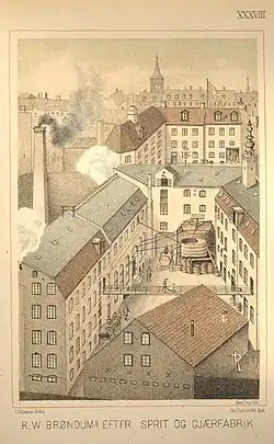 In 1842, Anders Antonsen Brøndum (1791–1861) purchased the property.[7] Anders Brøndum was the younger half-brother of Christen Brøndum. He had owned the distillery Paradis on Store Kongensgade from 1819 and was also the owner of the inns and associated distilleries Roskilde Kro (from 1838),[8] Store Kro in Kongens Lyngby and Bagsværd Kro in Bagsværd. He initially operated the property in Store Kongensgade as a brewery specializing in bavarian beer.[9] In 1844, Brøndum converted the brewery into a distillery and yeast factory.