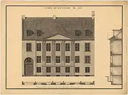 The property was later acquired by the businessman and landowner Jens Laurids Barfred (1756-1823). The present building fronting the site was constructed for him in 1801–.[3] The money came from his recent sale of one of his two estates, Benzonsdal.[4] His other estate Gjeddesdal remained in his possession until 1822. Barfred was hit hard by the economic crisis of the 1810s and went bankrupt in around 1729.[5]