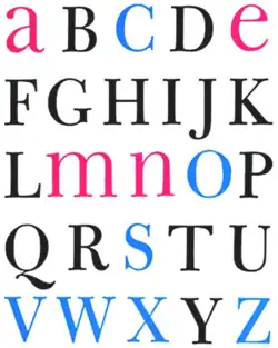 Alphabet 26.red: lowercase letter forms used; black: uppercase letter forms used; blue: letters that share the same form in lowercase and uppercase in the basic Latin alphabet.