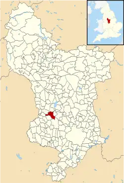 The village's parish church is dedicated to All Saints.[6] Primarily constructed in the late 14th century, but incorporating some earlier work, it has an unusual layout with an aisleless nave and chancel, and no tower.[6][7] In 1891 the church was described as "an edifice in the Decorated style of the early 14th century, consists of a small chancel and nave under a single roof, south porch and a wooden turret at the west end containing 3 bells, two of which date from 1722, the tenor being undated".[5]
