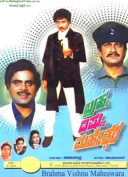 Brahma Vishnu Maheshwara (pronunciation) is a 1988 Indian Kannada-language action drama film, written and directed by Rajachandra and produced by Rohini Pictures. The film had an ensemble cast including Ambareesh, Ananth Nag, V. Ravichandran, Thulasi, Kiran Juneja and Mahalakshmi, while many other prominent actors featured in supporting roles.[1] The soundtrack and score composition were by Vijayanand, and the lyrics along with the dialogues were written by Chi. Udaya Shankar. The film was a remake of 1977 Tamil film Chakravarthy which was also remade in Telugu as Mugguru Mithrulu (1985) and in Hindi as Dosti Dushmani (1986).
