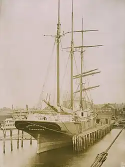 Barkentine ship Herbert Fuller at wharf in East Boston "at time of trial for the murder of the captain"