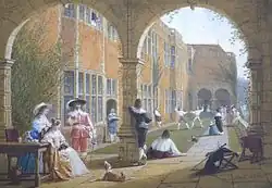 Numerous paintings and prints depict games and social events taking place on the lawn; one such painting by Joseph Nash, now in the National Fencing Museum, depicts 17th-century rapier practice, with a number of upper-class men, women and children as spectators.[22]