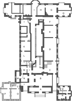 The building stands on the edge of a plateau, overlooking the park to the south.[44] The plan of the house is unusual, partly because of its incorporation of the earlier building; it extends at right angles to the primary (southern) façade.[42] The elevations are symmetrical, facing outwards, but the interior court is narrow, and projecting wings lie at either end of the eastern and western sides.[28]