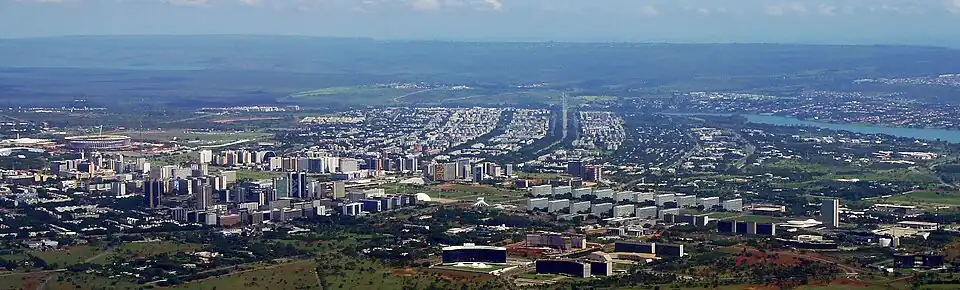 Aerial view of downtown Brasília (Pilot Plan) along the Monumental Axis, especially the new Mane Garrincha Stadium (left), the National Congress and the Three Powers Plaza (right). The entire residential area of North Wing (Asa Norte) is seen in the middle of the image.