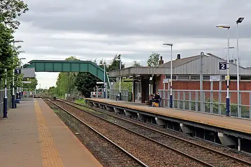 The station was modernised in 1976; the buildings on the eastbound side were replaced and the platforms were raised, with the result that the old waiting room on the Manchester side is three steps lower down. The original stationmaster's house survives, as does the 1916 footbridge.