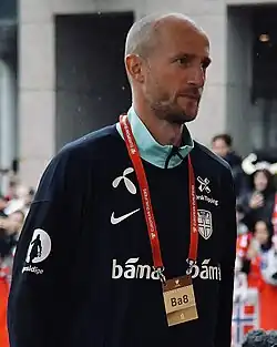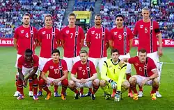 After playing 12 matches on the Norway under-21 national team,[29] Hangeland made his debut for the senior national team as a defensive midfielder in a 1–0 win against Austria on 20 November 2002.[30] After the UEFA Euro 2008 qualifying, national team coach Åge Hareide named him as captain instead of Vålerenga's player-coach Martin Andresen.[31] Hangeland's first goal came in his 62nd match; a UEFA Euro 2012 qualifying match against Iceland. He was capped 91 times, 48 of them as captain, and scored four goals for the Norway national team.[13][30]