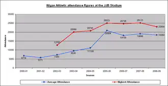 Wigan Athletic's average attendance was again the lowest in the league for the 2008–09 Premier League season.[46] Premier League attendances fell on average by around 426 per club during the 2008–09 season. Wigan Athletic's home attendance fell by more than this, with their average attendance for the 2008–09 season falling by 633 from the season before.[43] The highest attendance at the stadium for this season was a match between Wigan Athletic and Arsenal F.C., in which 22,954 people were counted. This attendance was 2,357 fans lower than the highest attendance in the season before.[43][44]