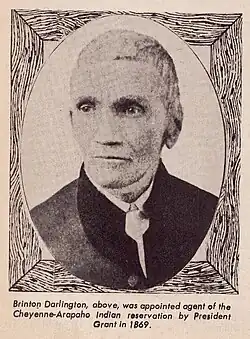 On April 21, 1869, Brinton Darlington was nominated in the US Senate to be appointed as an Indian Agent.[2] In May 1869 he was commissioned and appointed by President Ulysses S. Grant to the Upper Arkansas Agency, in the Indian Territory.[3] He was the first agent for the Cheyennes and Arapahoes.[4] Originally the Agency site was on Pond Creek but it was not a good location due to close proximity to the Osage and Kaws so it was moved outside of Fort Reno, which the tribes rejected. In 1870 the Commissioner of Indian Affairs in Washington told Darlington to set up the agency at the intersection of Chisholm Trail and the North Canadian River. In 1871, Darlington's daughter and son-in-law Jesse and Elma (Darlington) Townsend opened a day school at the Agency.[5] Jesse Townsend was also the Agency's issue clerk.[6] Brinton's son William T. Darlington worked at the agency, continuing on after his father's death. After Darlintgton's death, John DeBras Miles was appointed to replace him.
