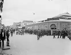 The Festival Hall was originally known as Brisbane Stadium, which was built in 1910.[1] In addition to its primary use as a venue to watch boxing, the Brisbane Stadium was also a venue for live concerts. Louis Armstrong, Nat King Cole and Johnnie Ray played there in the 1950s.[2] In 1958, the venue was demolished and a new building constructed, by then leading Queensland Construction Company E.J.Taylor & Sons, as part of the Centenary of Queensland. It was opened on 27 April 1959 and renamed Festival Hall. With a capacity of 4,000 people, it was the largest indoor public venue in the Brisbane inner city area and it remained the city's primary indoor venue for more than forty years. It was designed in a postwar modern style, similar to its namesake, the Royal Festival Hall in London.[1]