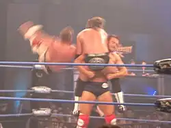 After losing the Team 3D Invitational tournament, the British Invasion tried to interfere in Beer Money, Inc.'s match on 6 May's Impact! but were prevented from doing so by Team 3D, who had gained respect for Beer Money, Inc.[8] The following week, Team 3D revealed in an interview that they had invited the British Invasion to TNA and felt betrayed by their villainous attitude. Williams responded by hitting Devon with a briefcase to cost them their match that week.[9] At Slammiversary, the British Invasion interfered in the TNA World Tag Team Championship match, causing Team 3D to lose their titles to Beer Money, Inc. Earlier in the evening, the British invasion were scheduled to face Rhino and Eric Young in a match, but Young walked out on his partner to be replaced by Rhino's prodigée Jesse Neal, but the British Invasion won regardless.[10] Because Mick Foley wanted a rematch of his own, he persuaded The Main Event Mafia to give him it by promising their tag team, Booker T and Scott Steiner, a World Tag Team Championship match.[11] This angered Team 3D who goaded the Main Event Mafia into a match for the contendership, but once again British Invasion interfered and used the briefcase to cause Team 3D to lose the match and with it, their chances of regaining the TNA World Tag Team Championship.[12] Team 3D countered by costing Williams his Ladder match for the X Division Championship briefcase, but afterwards the British Invasion, helped by Bashir and Kiyoshi, assaulted Team 3D.[6] That Sunday, at the Victory Road PPV, the British Invasion faced Team 3D for the IWGP Tag Team Championship, a championship sanctioned by New Japan Pro-Wrestling (NJPW) which had a working agreement with TNA at the time. The British Invasion lost their match and afterwards Team 3D drove Bashir through a table.[13]